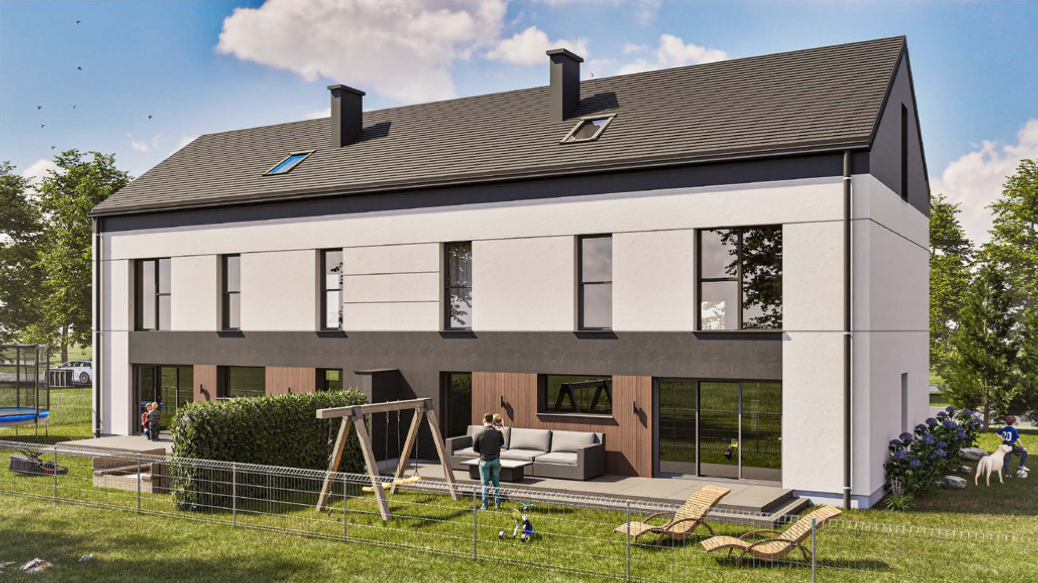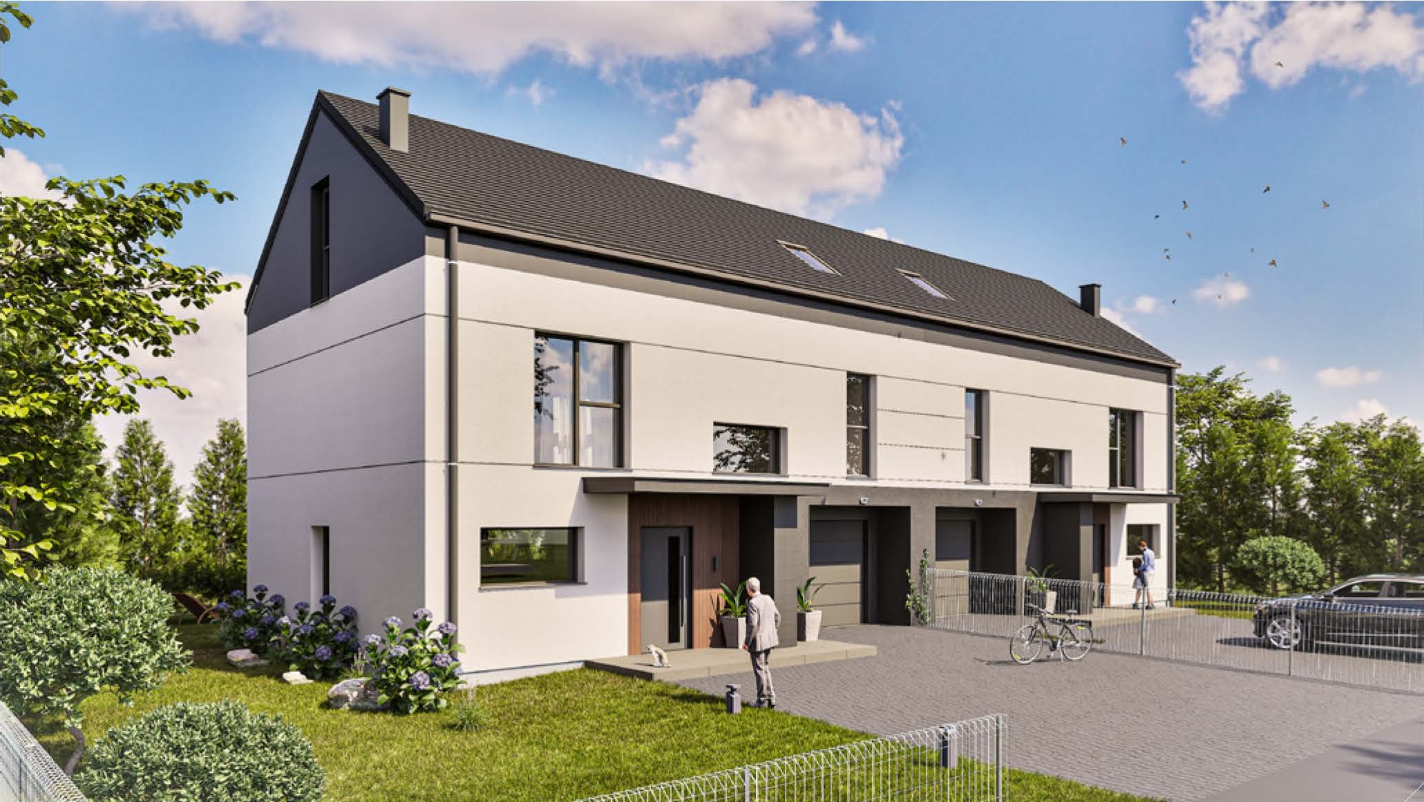 Każdy z budynków posiada indywidualny garaż oraz zewnętrzne miejsce postojowe jak